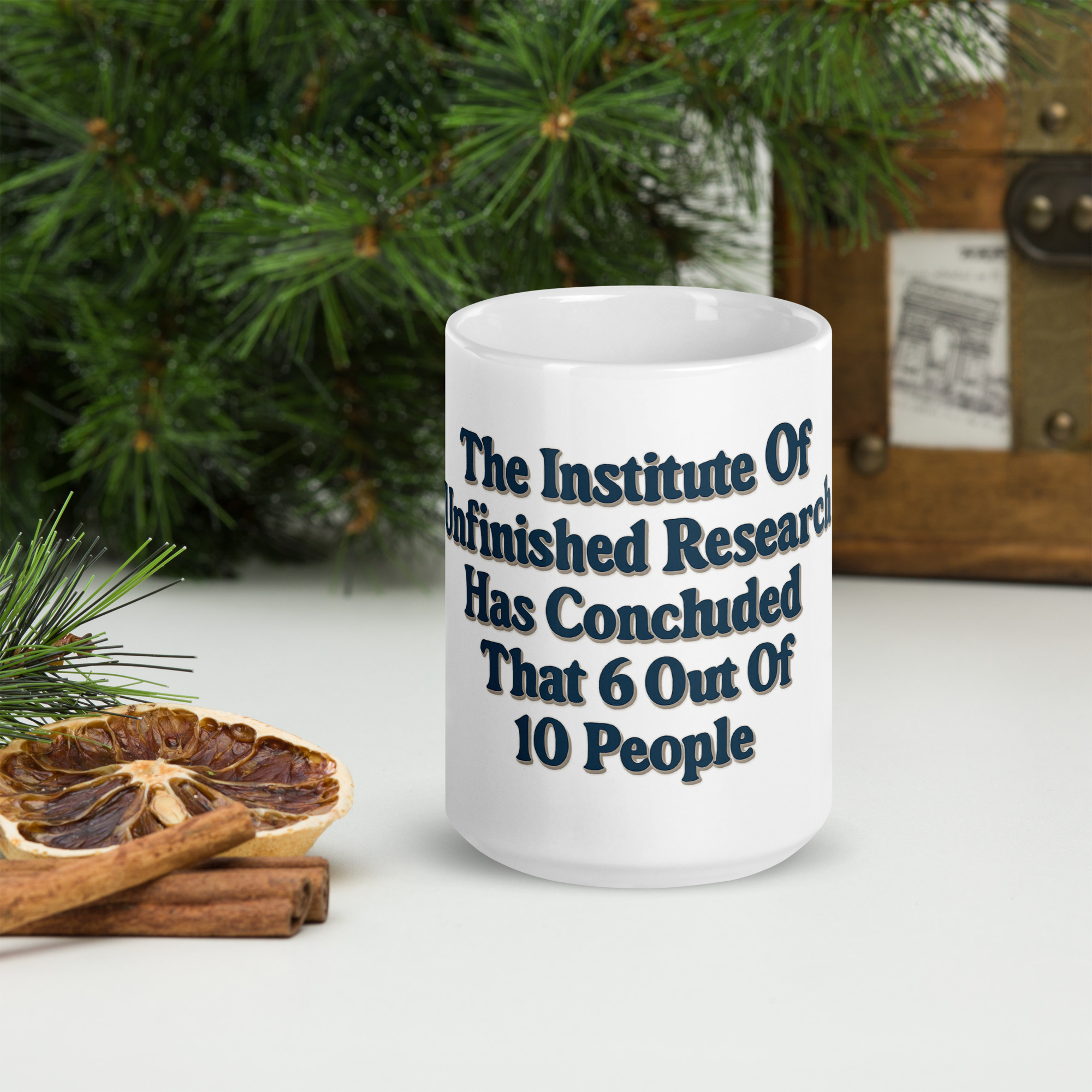 Witty Print: Featuring the amusing statement “The Institute of Unfinished Research has concluded that 6 out of 10 people,” this mug sparks curiosity and invites conversation.